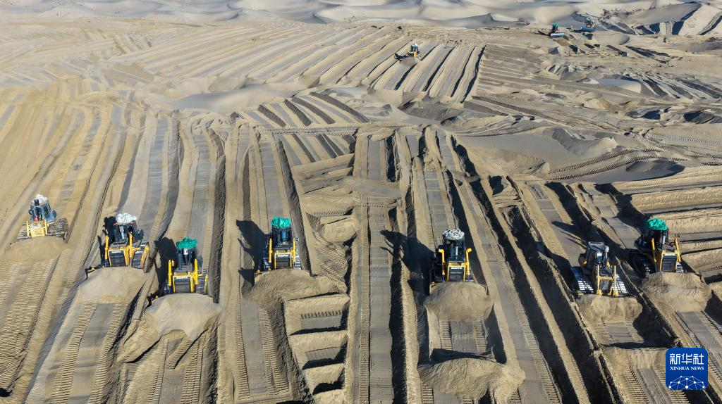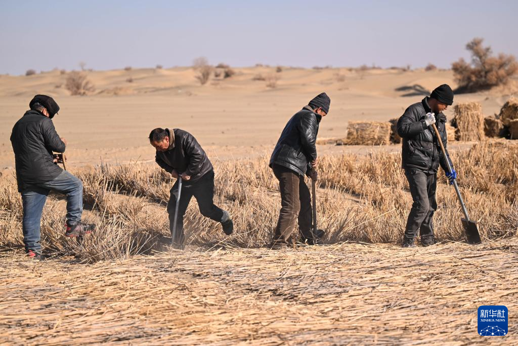 寒冬时节,尽管塔克拉玛干沙漠南缘的新疆和田地区墨玉县气温跌破零摄氏度,这里却涌动着治沙攻坚的热潮。数十台推土机轰鸣作业,推筑阻沙堤、平整沙丘,本地农户忙着收割加工芦苇、铺设草方格,冬季治沙工程高效推进。