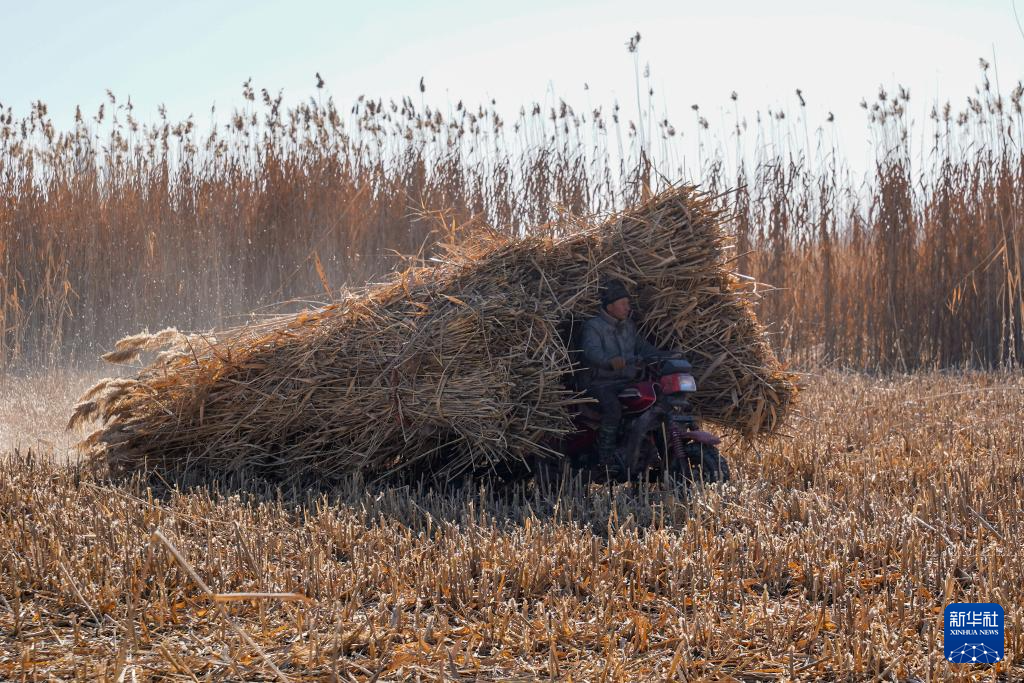 在新疆和田地区墨玉县扎瓦镇,当地农民运送收割的芦苇(1月10日摄)。