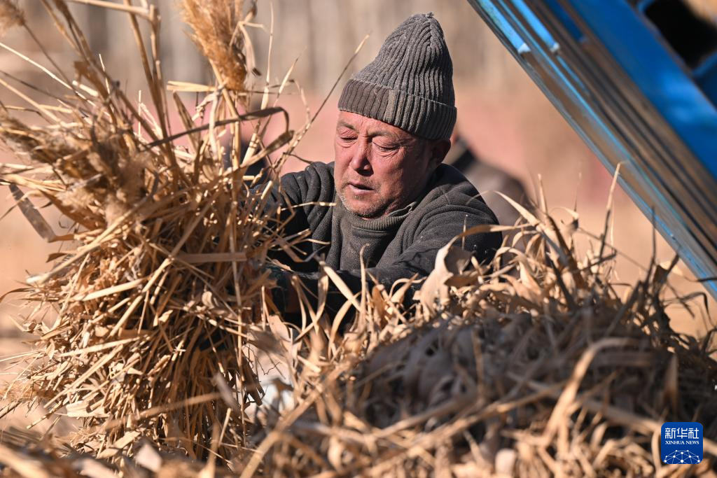 在新疆和田地区墨玉县扎瓦镇,当地农民在收割芦苇(1月10日摄)。