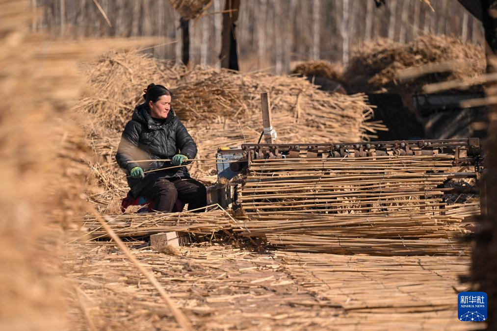 在新疆和田地区墨玉县碧玉农产品农民专业合作社,农户将收割的芦苇压制成捆(1月10日摄)。