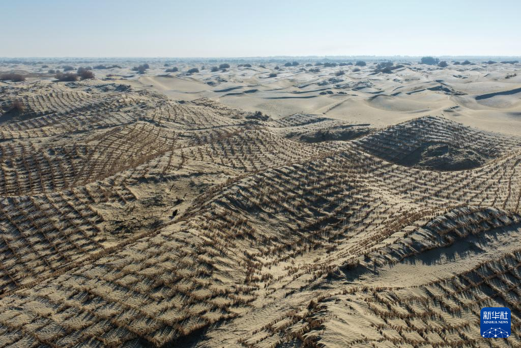这是在新疆和田地区墨玉县喀瓦克乡周边沙漠拍摄的草方格(1月11日摄,无人机照片)。