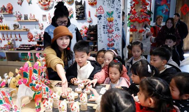 1月10日,浙江杭州一家沉浸式非遗体验空间内,游人体验皮影戏、花灯等年味非遗文创。图为游人观赏泥塑作品。中新社记者 肖健摄