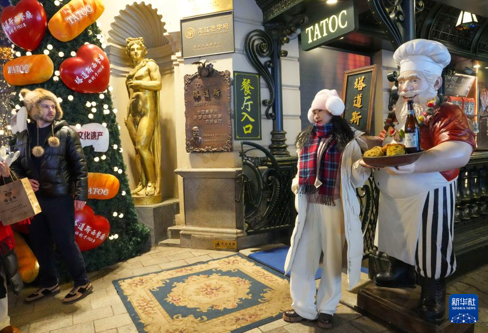 1月11日,游客在哈尔滨中央大街的肖克庭院游玩。