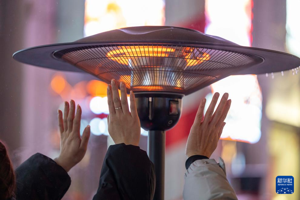 1月12日,游客在哈尔滨中央大街上取暖。