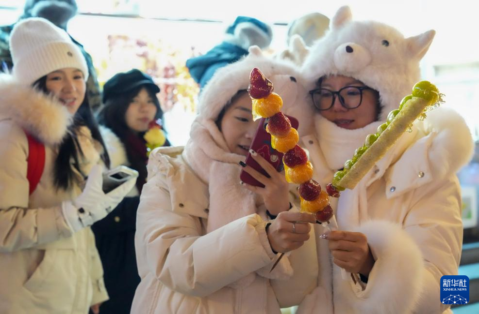 1月8日,游客在哈尔滨中央大街拿着糖葫芦拍照。