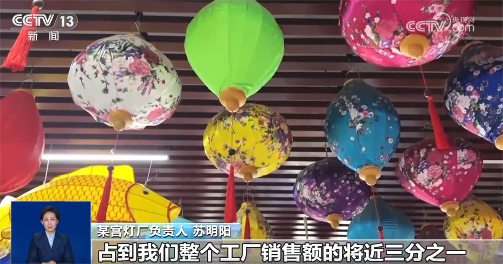 某宫灯厂负责人苏明阳:现在一天直播4小时—5小时,到年底我们一天开播将近16个小时。在线上卖,占到我们整个工厂销售额的将近三分之一。