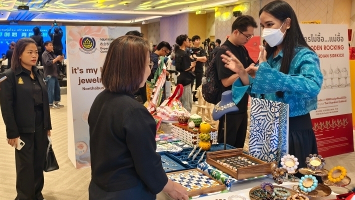当地时间1月14日,“无界创想,青春链接”中泰青年文化交流系列活动在曼谷开幕。图为开幕式现场的泰国工艺品展示。中新社记者 李映民 摄