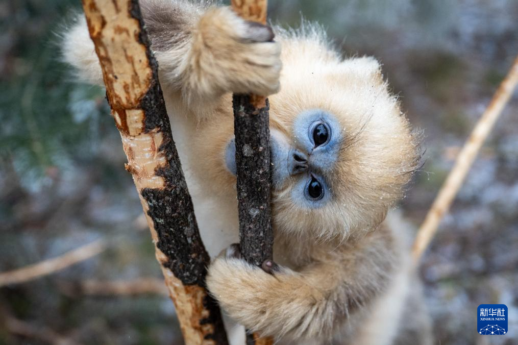 1月19日,一只金丝猴在神农架国家公园大龙潭金丝猴野外研究基地啃食树皮。