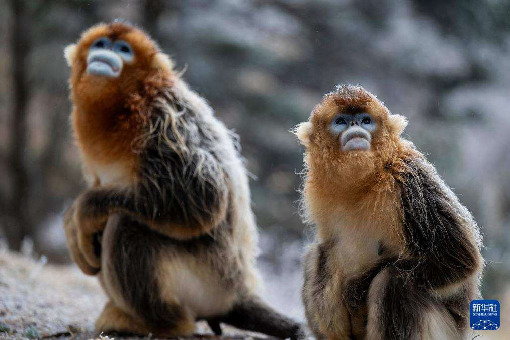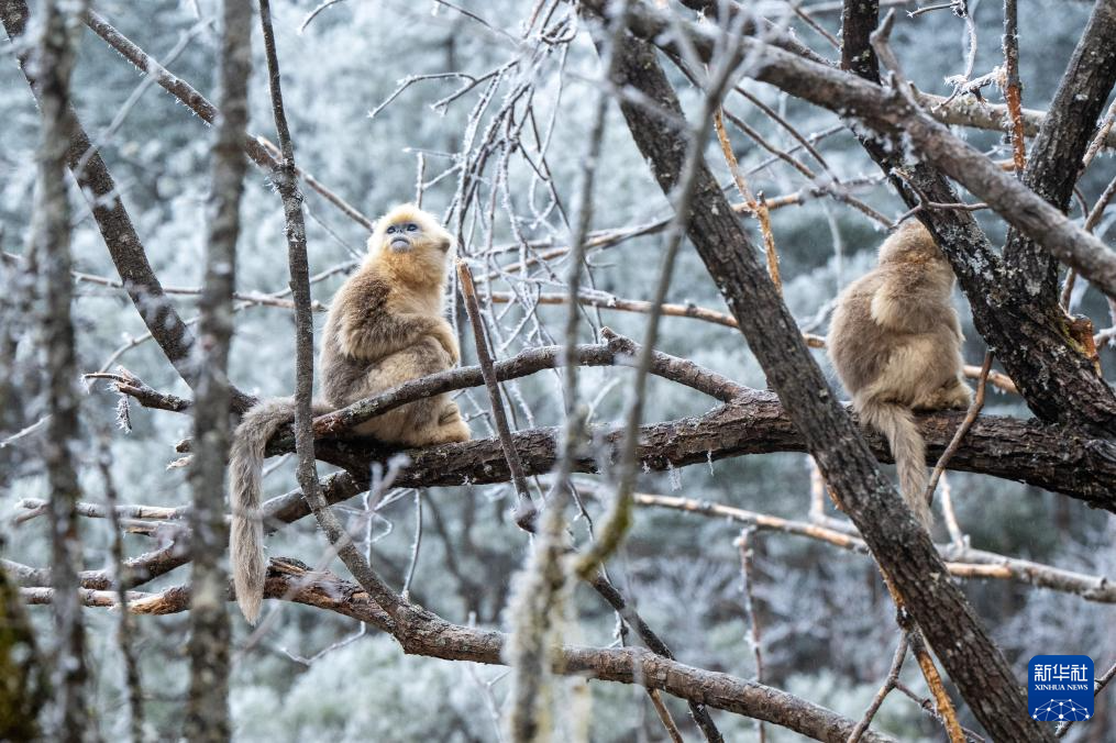 1月19日,两只金丝猴在神农架国家公园大龙潭金丝猴野外研究基地树枝上休憩。