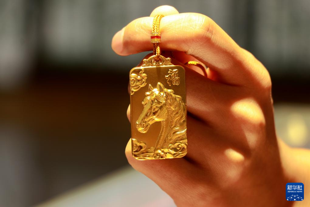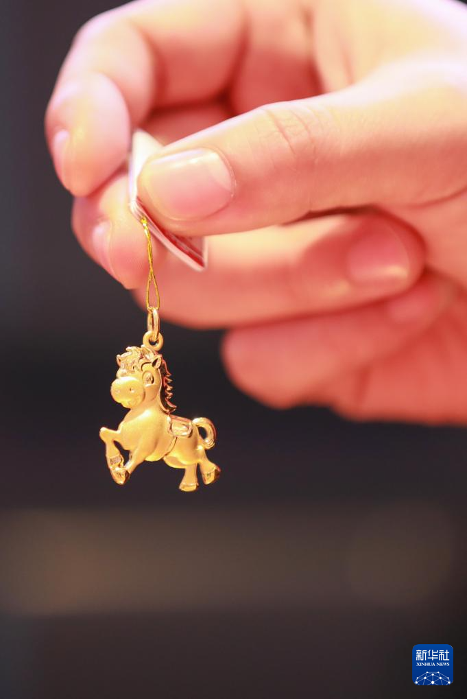 1月16日,在山东省滨州市滨城区一家金店,工作人员展示马年主题的黄金饰品。