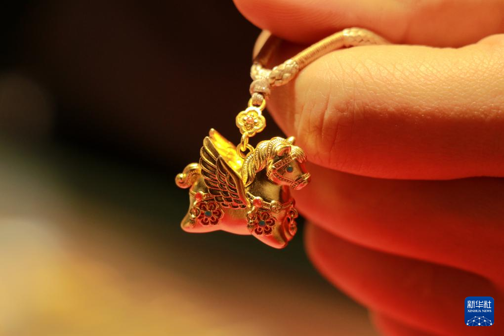 1月16日,在贵州省黔东南苗族侗族自治州从江县一家黄金店,店员在展示生肖马主题的黄金饰品。