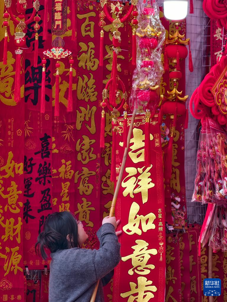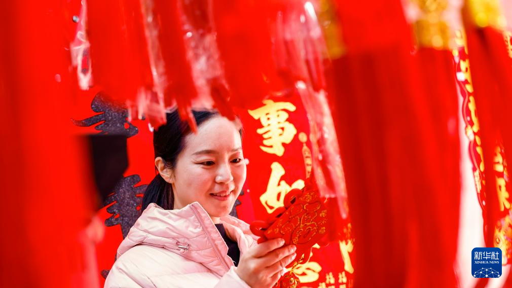 1月28日,市民在河南省信阳市光山县公安街市场内选购春节饰品。