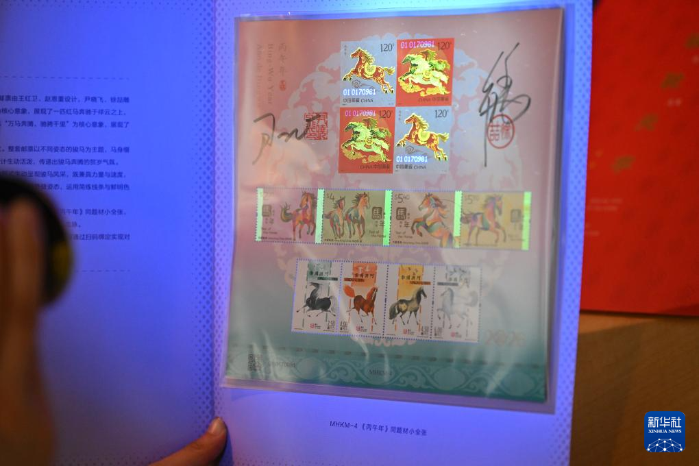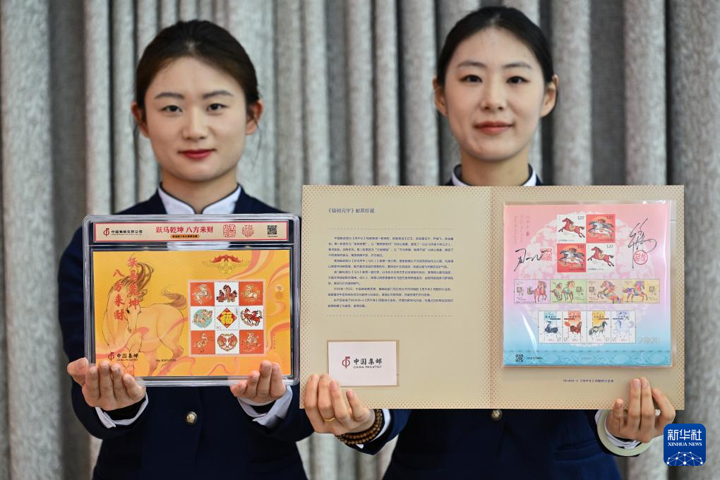 1月29日,工作人员展示活动现场发布的《跃马乾坤八方来财》雕刻版生肖主题邮票珍藏摆件(左)和《骏驰元宇》邮票珍藏册。