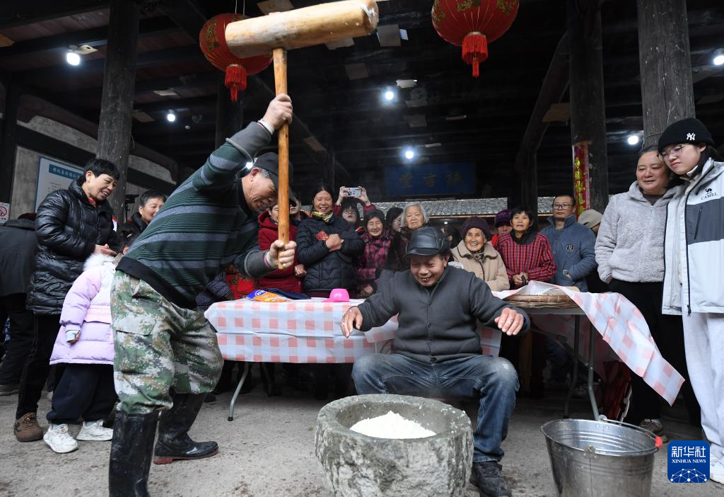 1月31日,人们在五泄镇十四都村古民居观看村民打麻糍。