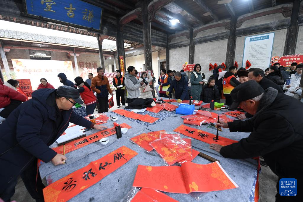 1月31日,书法爱好者在五泄镇十四都村古民居写春联送祝福。