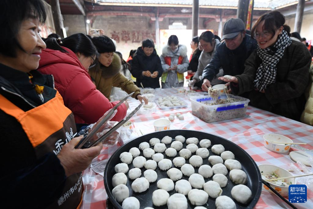 1月31日,在五泄镇十四都村古民居,人们学习制作当地特色的西施团圆饼。