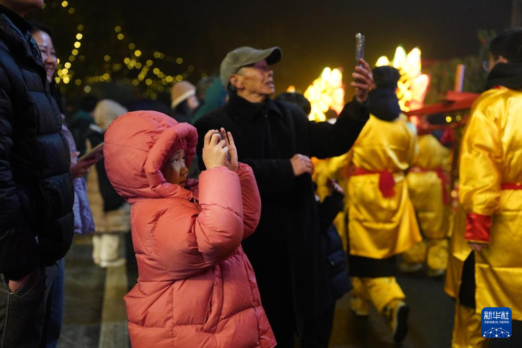 一名小朋友观看神山村举行的板凳龙表演(1月31日摄)。