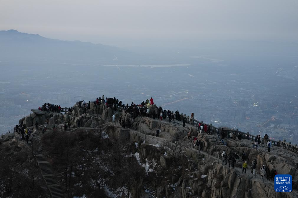 2月6日,游人在泰山日观峰景区等候日出。