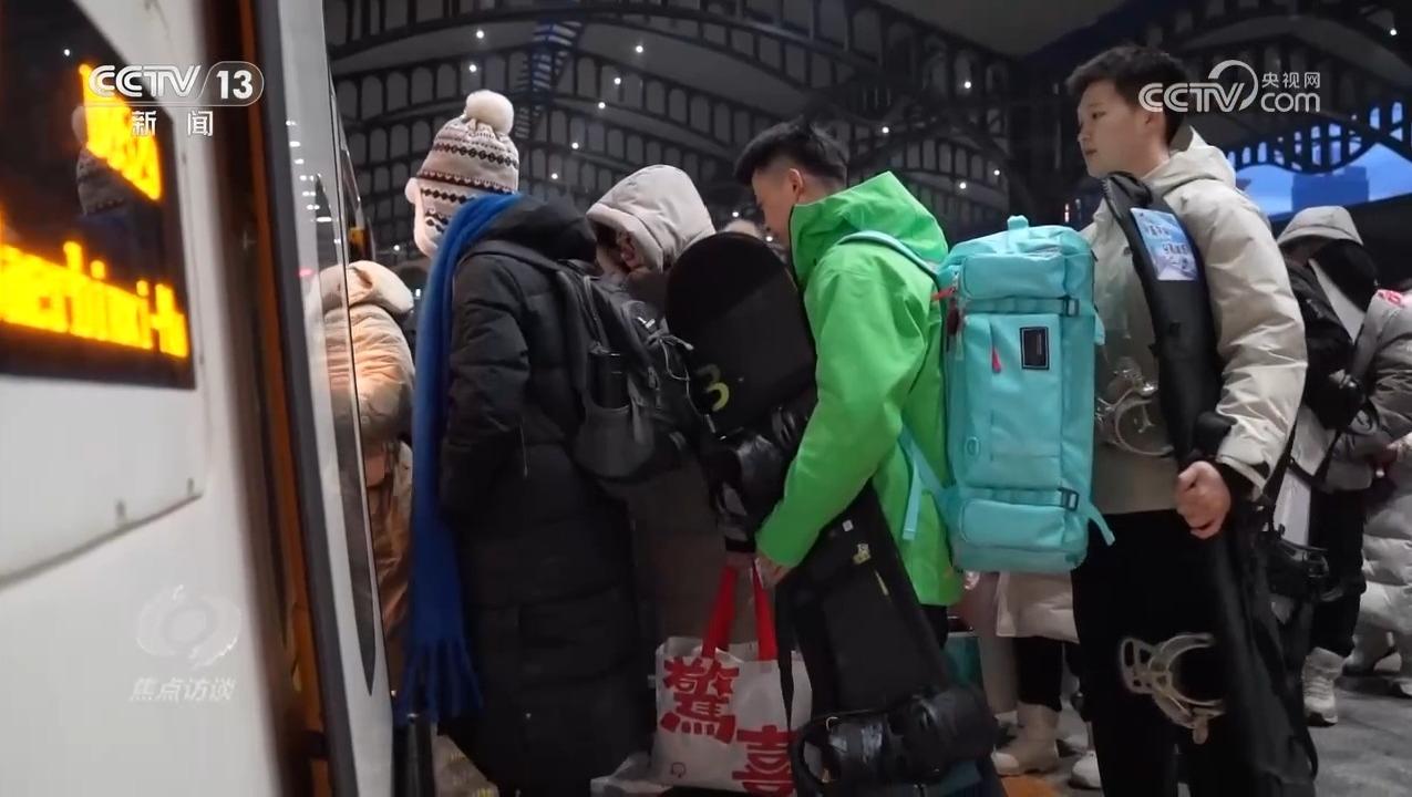 “轻装行”让回家的路少了行李负担,在东北,今年1月开始试点的“雪具便利行”,解决了旅客的另一种“行李负担”。以往,由于滑板等雪具普遍超出铁路部门要求的动车组行李长宽高之和以及杆状物品不能超过130厘米的规定,滑雪爱好者只能乘坐大巴或者自驾前往,既费时还不安全,而现在通过线上预约就可以随车携带了。凌晨5点多,记者跟随小贾等几位滑雪爱好者来到哈尔滨火车站,准备搭乘从哈尔滨前往亚布力滑雪场的列车,体验一把“雪具便利行”。