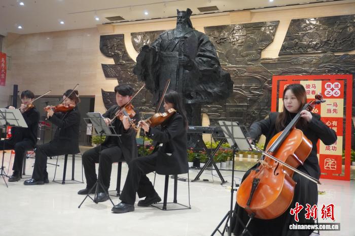 2月10日是农历腊月二十三,中国北方小年。当晚,在河南郑州商代都城遗址博物院,一场中西合璧的音乐会吸引中外观众驻足,在音乐声中共度小年夜。图为西洋乐器演奏。中新社记者韩章云 摄