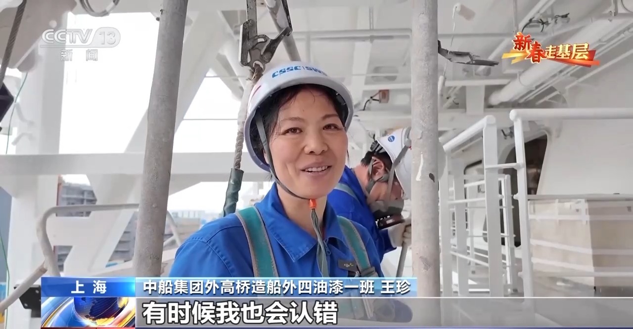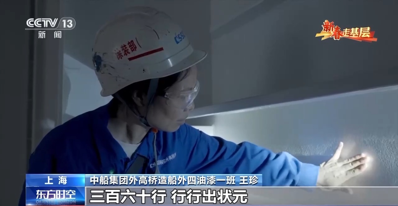 中船集团外高桥造船外四油漆一班王珍:三百六十行,行行出状元。不知道我是不是那个状元,但是我用心去做,还是挺喜欢的、挺热爱的。