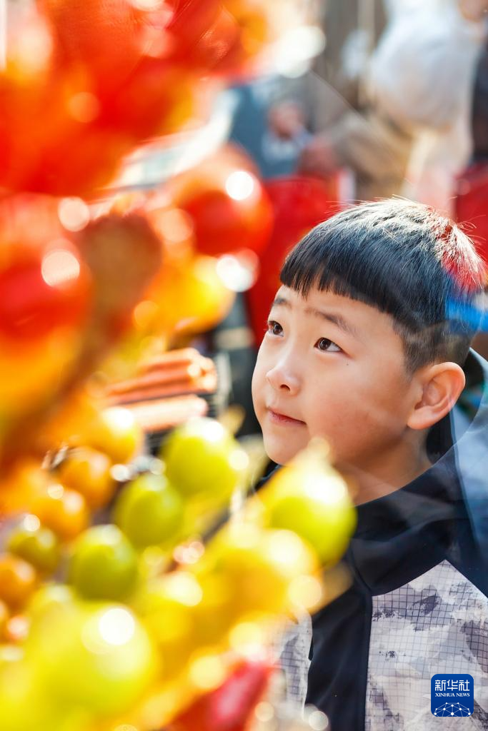 2月10日,小朋友在天津芦台大集上购买冰糖葫芦。