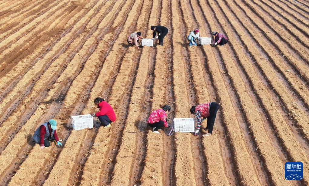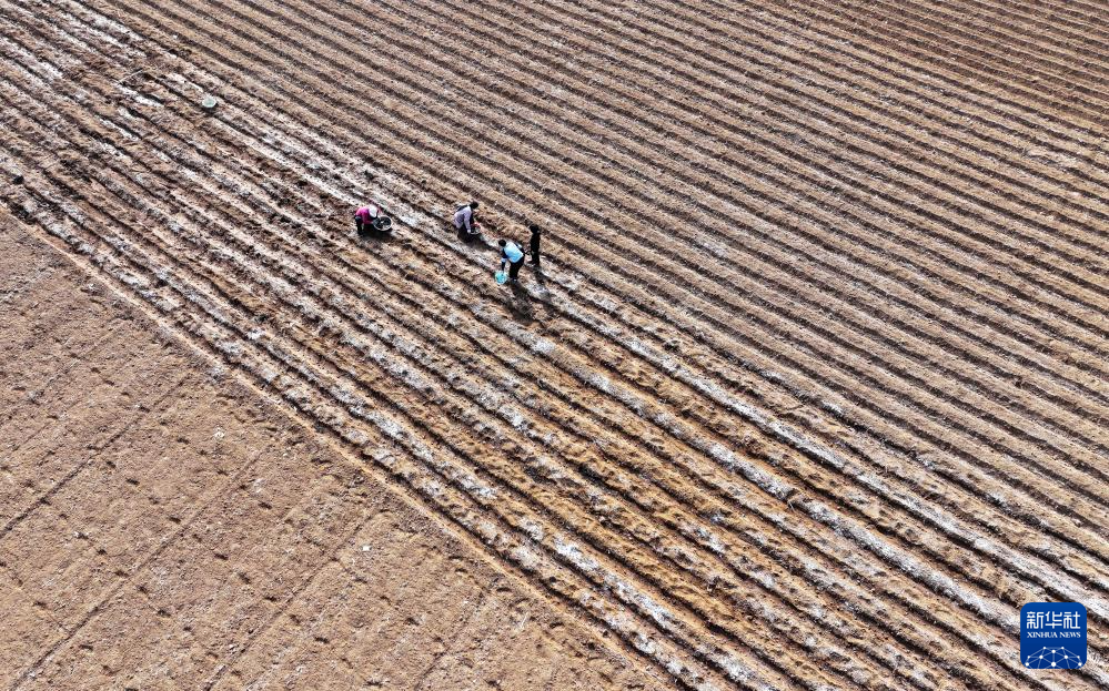 2月13日,在山东省枣庄市山亭区桑村镇,农民在播种马铃薯(无人机照片)。