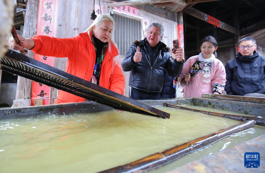 2月12日,在湖南省湘西土家族苗族自治州永顺县灵溪镇洞坎村,游客体验湘西手工抄纸。