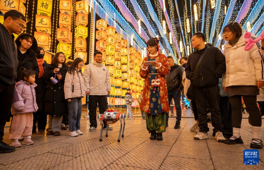 2月11日,在江西省新余市仙女湖新春灯会上,机器狗吸引了游人的目光。