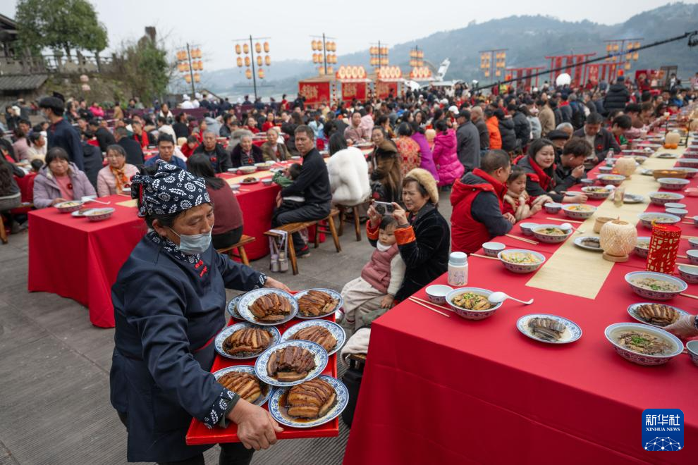 2月16日,在重庆永川松溉古镇,人们在一场千家宴活动现场体验中国年味。