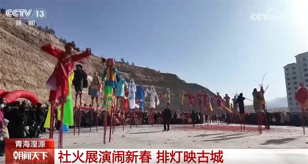 在青海湟源县的社区广场上,热闹的社火展演拉开帷幕,身着特色服饰的舞者踏着铿锵鼓点扭起秧歌,金黄与赤红相间的龙狮穿梭人群,高跷上的表演者扮相诙谐、动作舒展,热闹氛围弥漫内外。丹噶尔古城内人头攒动,百余盏湟源排灯沿城墙次第高悬,将街巷铺成暖色长廊。