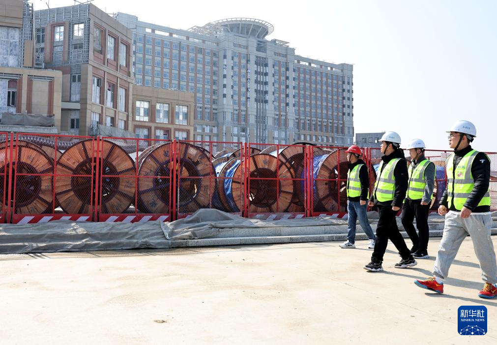 2月18日,在上海复旦大学附属中山医院青浦新城院区一期工程建设项目现场,工人们在工地内的电缆存放区巡查。