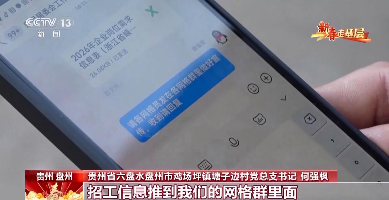 贵州省六盘水盘州市鸡场坪镇塘子边村党总支书记何强枫:招工信息推到我们的网格群里面,一对一地给我们务工人员推荐就业岗位,这样的一个长效机制建立起来以后,也解决了我们村就业难的问题。