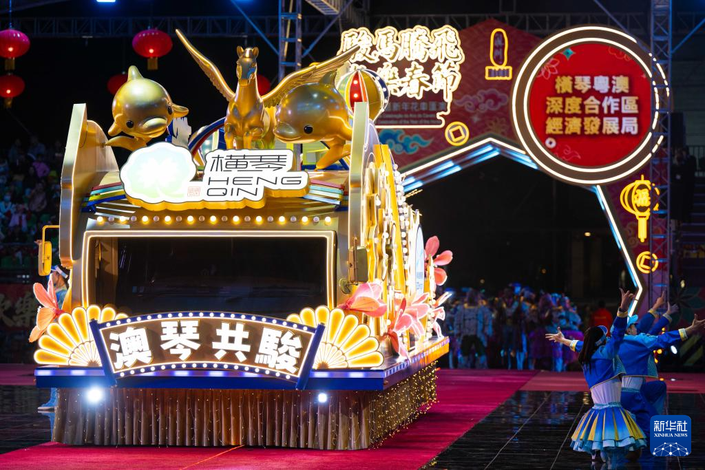 2月19日,在“骏马腾飞 欢乐春节 2026农历新年花车汇演”上拍摄的横琴粤澳深度合作区经济发展局花车。