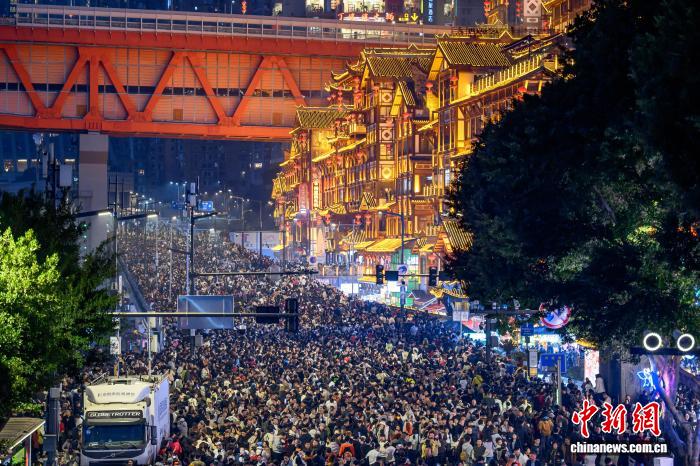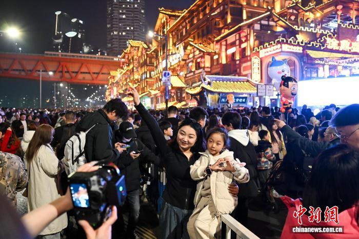 2月19日,农历大年初三,夜晚的洪崖洞灯火辉煌,游人如织。春节假期,位于重庆市渝中区的洪崖洞景区迎来客流高峰,为保障游客安全,提升观赏体验,当地启动临时交通管制,将洪崖洞前道路封闭,暂停社会车辆通行,方便游客赏景游玩。中新社记者何蓬磊 摄