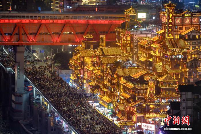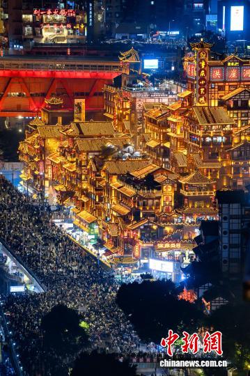2月19日,农历大年初三,夜晚的洪崖洞灯火辉煌,游人如织。中新社记者 何蓬磊 摄