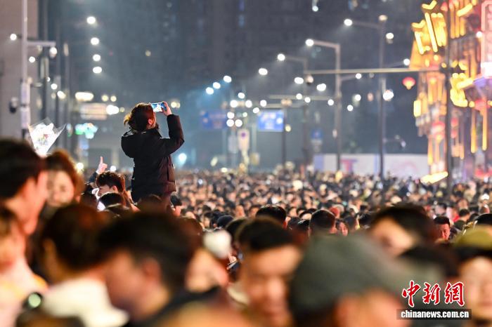 2月19日,农历大年初三,游客在人群中拍摄洪崖洞夜景。中新社记者 何蓬磊 摄