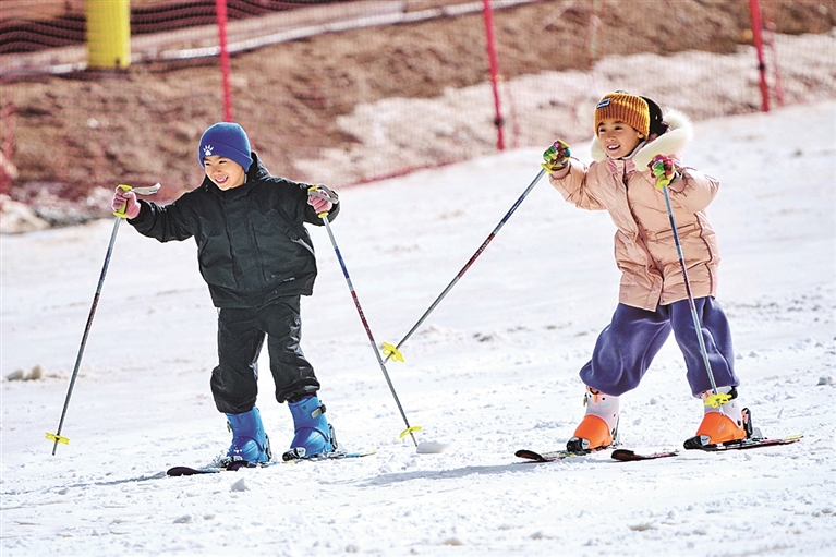 小朋友在宁夏银川市阅海滑雪场体验冰雪运动。新华社发
