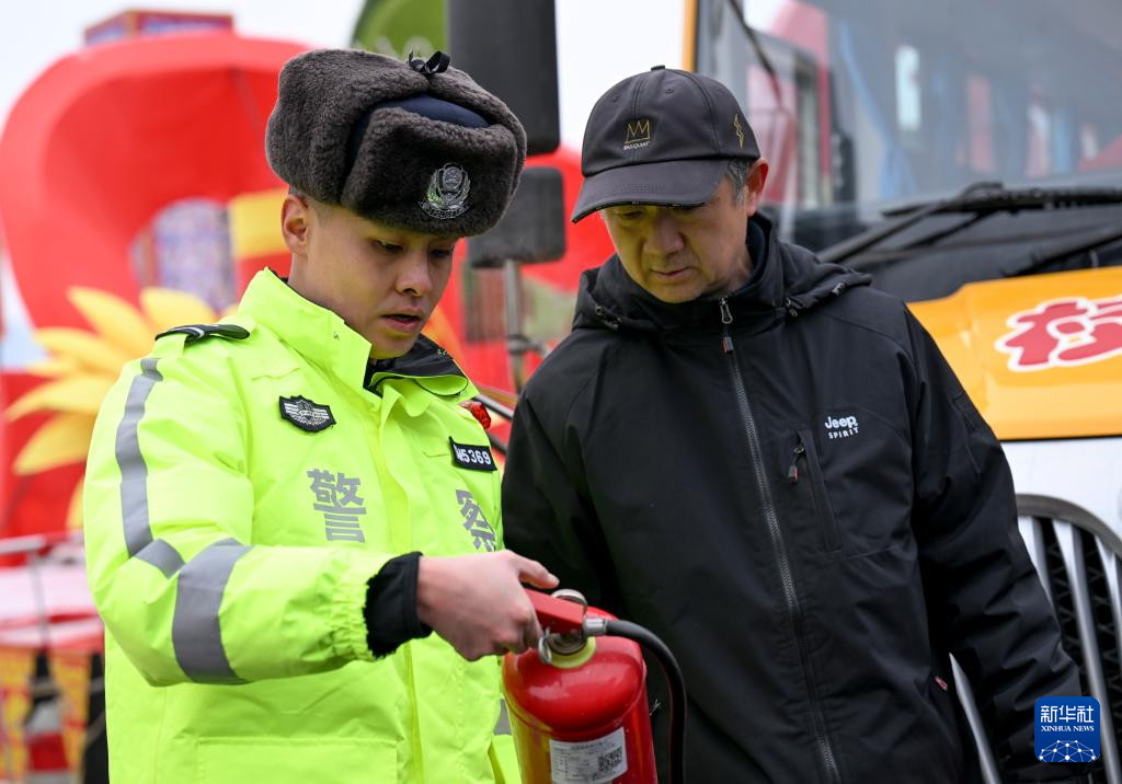 2月27日,新疆乌鲁木齐市公安局交通管理支队水磨沟区大队民警(左)在检查校车灭火器。