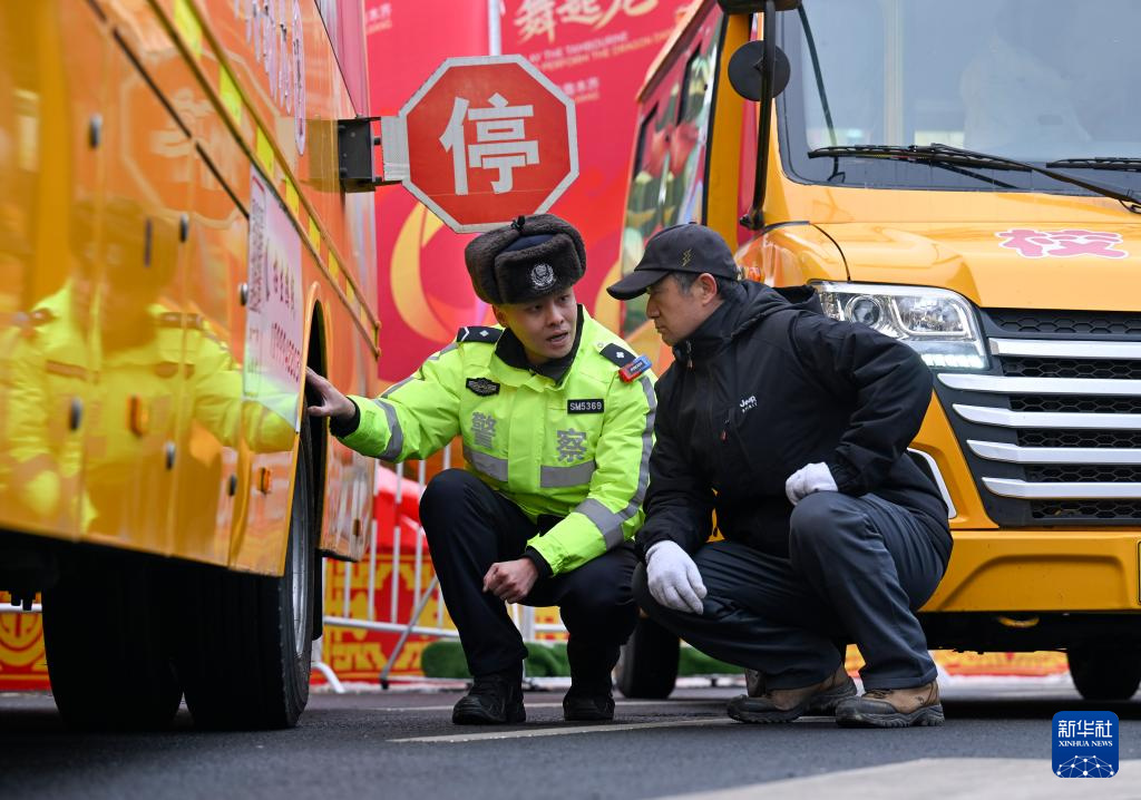 2月27日,新疆乌鲁木齐市公安局交通管理支队水磨沟区大队民警(左)在检查校车轮胎。