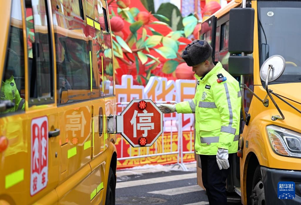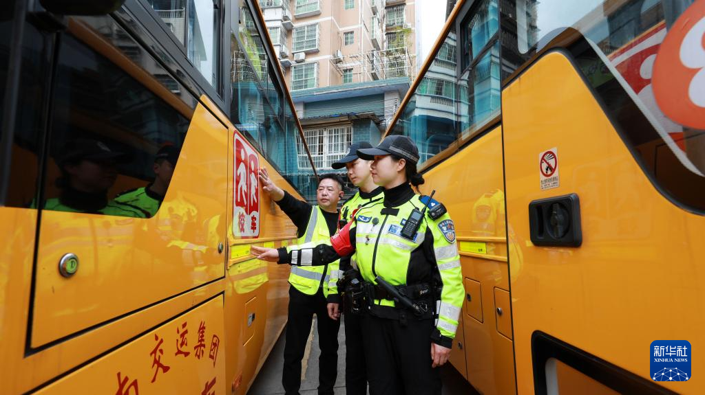 2月27日,新疆乌鲁木齐市公安局交通管理支队水磨沟区大队民警(右)在检查校车外观。