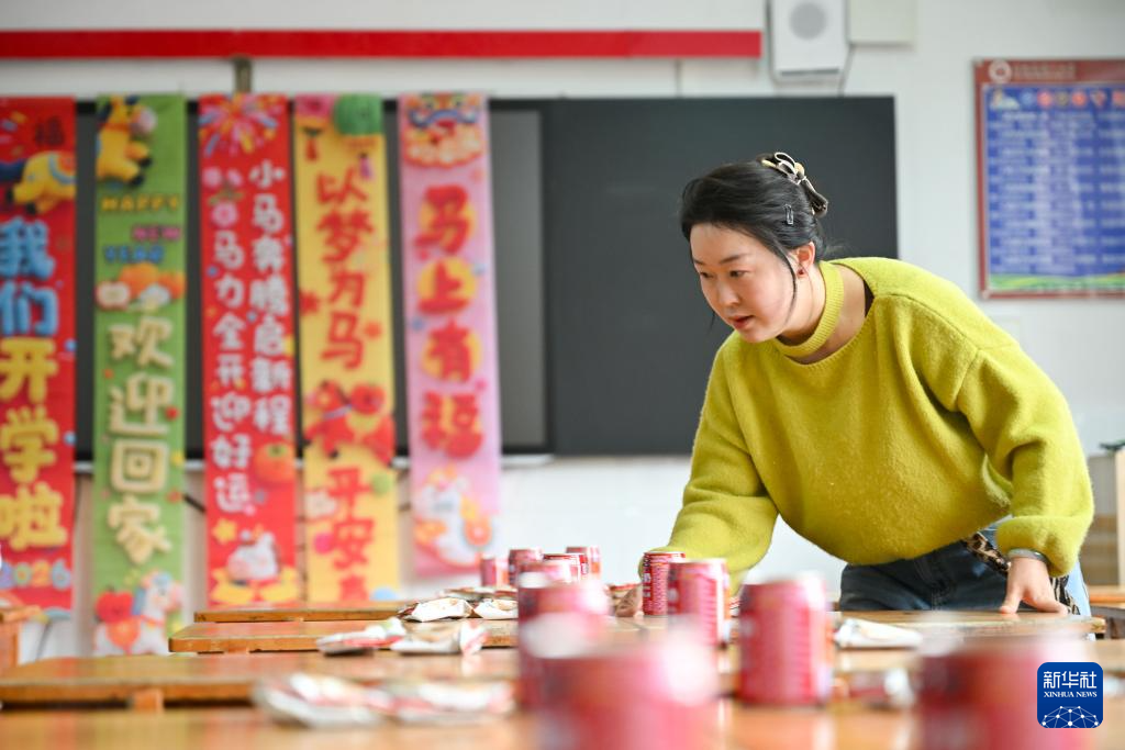 2月27日,老师在贵州省开阳县第一小学布置教室。