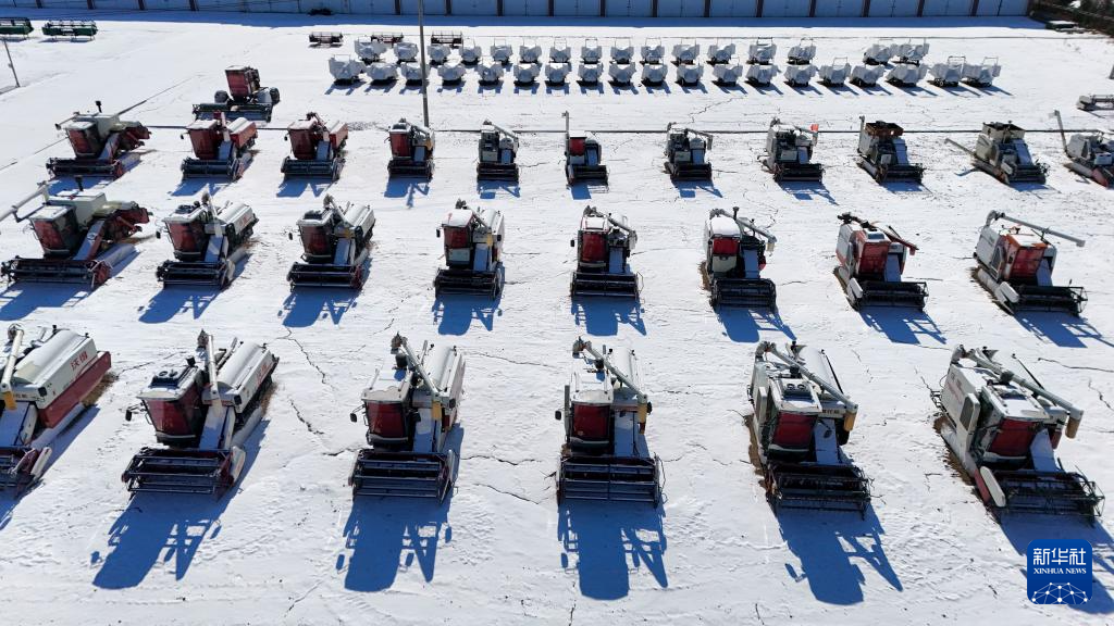 2月28日,在位于双鸭山市的黑龙江北大荒农业股份有限公司友谊分公司,完成检修保养的农机具整齐停放(无人机照片)。新华社记者 王松 摄