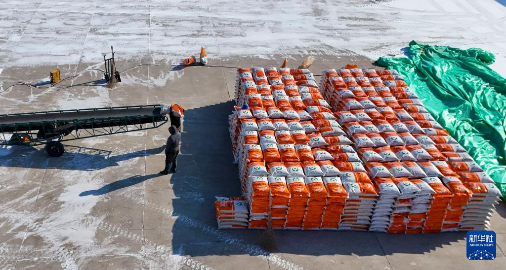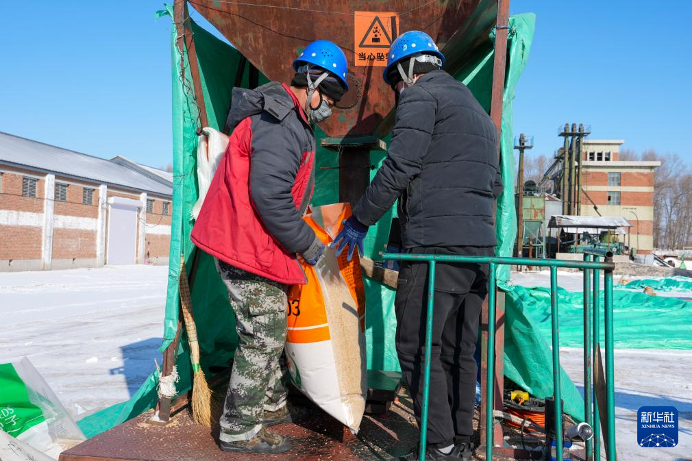 2月28日,在位于双鸭山市的黑龙江北大荒农业股份有限公司友谊分公司,工作人员打包稻种(无人机照片)。新华社记者 王松 摄