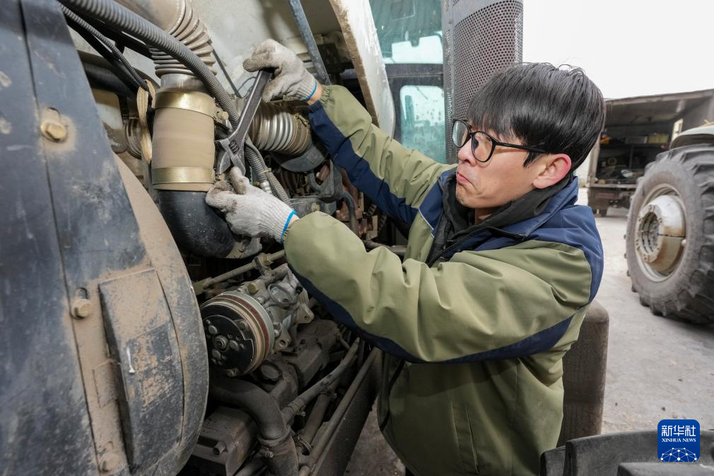 2月27日,在位于双鸭山市集贤县升昌镇的永胜农机合作社,工作人员对农机具进行检修保养。新华社记者 王松 摄