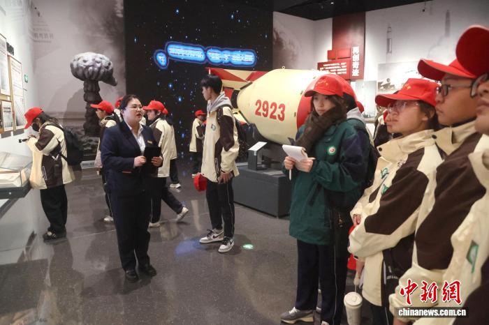 3月1日,2026年青海省大中小学生“走进原子城”爱国主义教育活动启动,近500名大中小学生走进海北州海晏县原子城纪念馆,开启“开学第一课”。青海原子城纪念馆是中国唯一全面、系统介绍中国原子能科学技术事业和核工业创建与发展历程、原子城特殊历史与辉煌成就的大型综合性专题纪念馆,也是两弹历史的核心纪念地。图为学生在讲解员的讲解下参观展品。中新社记者张忠苹 摄