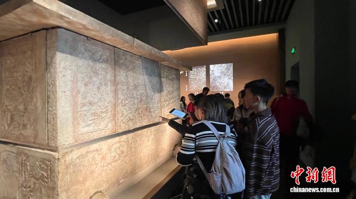 民众在山西博物院“民族熔炉”展厅参观虞弘墓石椁上的马形象。杨静摄