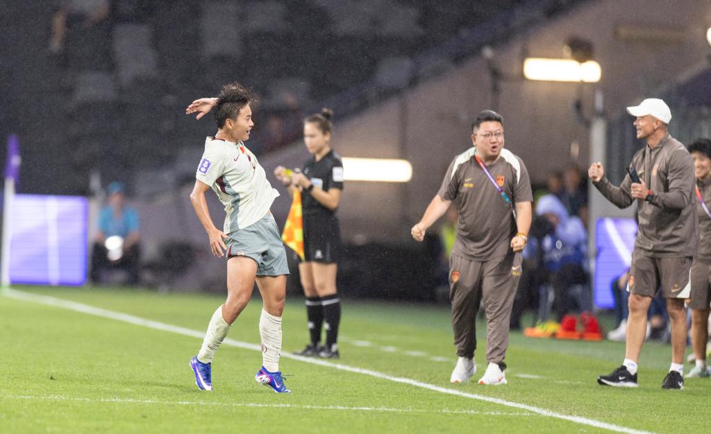 3月9日,中国队球员王霜(左)庆祝进球。新华社发(胡泾辰摄)