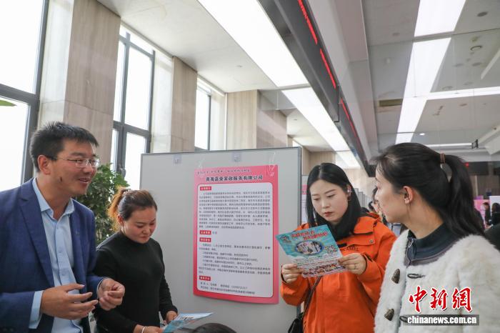 3月11日,“春风十里 职为等你”女性专场招聘会在青海省会西宁举办。现场提供会计、文员、家政等岗位800余个,吸引求职者前来应聘。图为求职者(左二)了解用工信息。中新社记者马铭言 摄