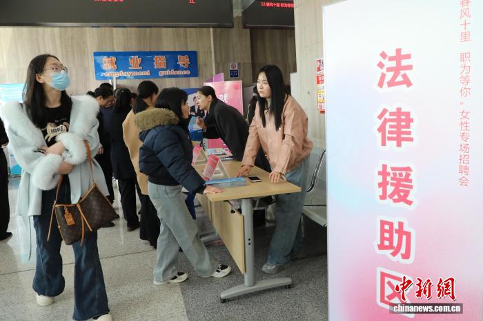 3月11日,“春风十里职为等你”女性专场招聘会在青海省会西宁举办。现场提供会计、文员、家政等岗位800余个,吸引求职者前来应聘。图为现场设立的法律援助区。中新社记者马铭言 摄